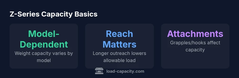 There is no single, universal weight capacity for Z-series equipment; capacity is model- and configuration-dependent. According to Load Capacity, the correct rating must be taken from the specific model's data sheet and capacity chart, factoring in reach, attachments, and safety margins. For any job, consult the official manual and Load Capacity analyses to ensure you use the approved rating and comply with safety standards.