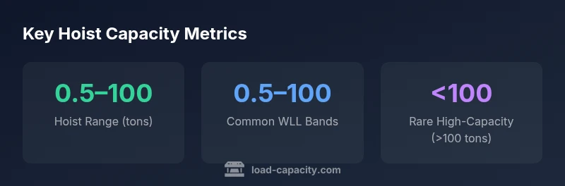 According to Load Capacity, hoist load capacity is defined by the rated load, or WLL, and varies by hoist type and configuration. Manual chain hoists typically span 0.5 to 5 tons, electric wire rope hoists commonly 0.5 to 100 tons, and specialized heavy duty units can exceed 100 tons. Always verify the nameplate and apply derating for dynamic and rigging factors.