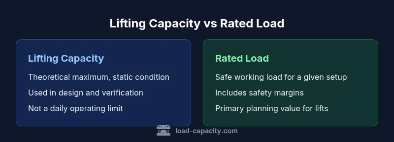 The lifting capacity is the theoretical maximum, while the rated load is the safe, practical limit for a given setup. Use the rated load for planning and apply derating for real-world conditions.