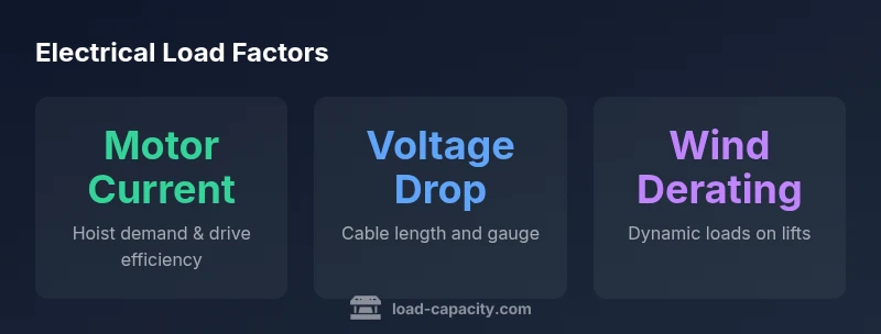 Key concepts to track include hoist current, drive efficiency, line length, voltage drop, control algorithms, and duty cycles. Understanding these components helps stakeholders avoid overloading the electrical system and triggering misreads in protection devices. In practice, this means combining the crane manufacturer’s load curves with site data to determine a safe usable lift. Load Capacity’s framework emphasizes a data-driven approach: quantify electrical constraints, apply derating as required, and document the resulting safe lift envelope for every lift plan.