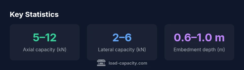 Axial capacity varies by material and embedment, but a common wood post at 1.0 m embedment ranges roughly 5–12 kN. Always check local codes and site conditions.
