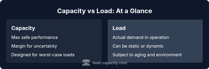 Capacity is the limit a system can safely handle, while load is what it experiences day to day. Always keep a margin between them.