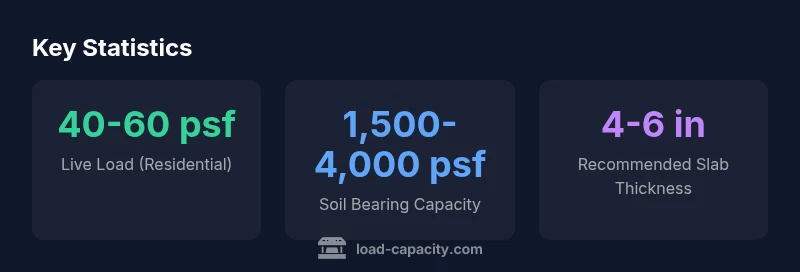 A concrete slab load capacity chart is a design tool that translates the expected loads on a slab into per-area allowances (psf). The chart integrates material properties, geometric factors, and site conditions to provide safe, code-compliant guidance for engineers and technicians. According to Load Capacity, the chart helps teams standardize decisions across projects by capturing the cumulative effects of slab thickness, reinforcement, and soil bearing capacity. The Load Capacity team found that readers benefit from clearly defined categories (slab-on-grade, elevated slabs, and slabs with footings) and explicit notes on dead load, live load, and impact loads. By comparing different slab configurations side-by-side, practitioners can quickly identify whether a design meets the required safety margins. The goal is to facilitate reliable, repeatable design decisions without resorting to bespoke calculations for every project. In practice, the chart serves as a living reference that must be updated to reflect changes in codes, materials, and site conditions. This article uses the concrete slab load capacity chart as a baseline for discussion, illustration, and application.