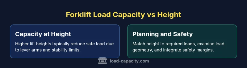 The interaction between lift height and load capacity is a core consideration in warehouse design and daily operations. The term forklift load capacity vs height captures how weight ratings are not a single universal number but depend on the mast position, reach, and load geometry. According to Load Capacity, effective capacity can vary with how high you lift, and this is a fundamental safety and efficiency factor for engineers, technicians, and fleet managers. In evaluating equipment, planners must translate task requirements into a height-to-capacity equation that accounts for load weight, center of gravity, pallet dimensions, and the working environment. By framing decisions around height-adjusted capacity, teams can avoid underestimating risk while still achieving productive throughput. This first block sets the stage for a rigorous, methodical approach to matching forklifts to specific height scenarios without relying on generic numbers or assumptions.