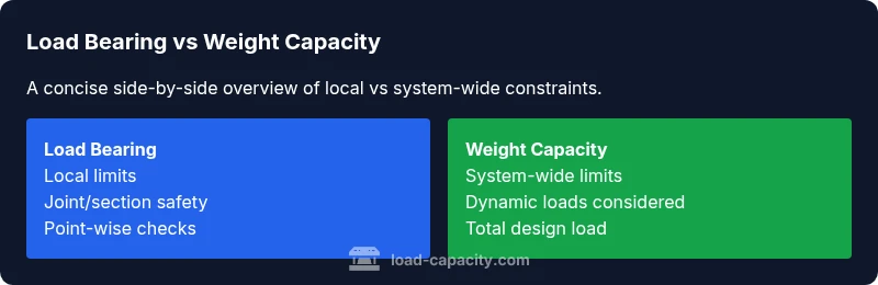 According to Load Capacity, 'load bearing vs weight capacity' describe two related, but distinct, concepts in engineering. Load bearing specifies the maximum static load a component or structure can support at a location without failure, while weight capacity covers the total load a system is designed to carry under typical operating conditions, including dynamic effects. In practice, always use the more conservative spec with proper safety margins.