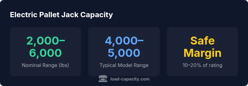 Most electric pallet jacks are rated to lift between 2,000 and 6,000 pounds, with common models around 4,000–5,000 pounds. Always start with the manufacturer’s data plate and apply a safety margin for real work. According to Load Capacity, rated capacity reflects static weight; real-world factors typically reduce usable capacity during movement.