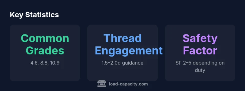 Bolt grade exerts a strong influence on capacity, especially for M12 bolts. Grade 4.6 bolts offer lower strength and are suitable for light-duty joints where load demands are modest. Grade 8.8 bolts provide higher tensile strength and are common in medium-duty connections where reliability is important. Grade 10.9 bolts deliver the highest strength among the common metric classes, enabling higher load capacity for demanding applications. The Load Capacity Team notes that the exact capacity for any given bolt depends on engagement length and service conditions; thus, grade alone does not guarantee performance. In many cases, designers select a higher grade than minimum to maintain a comfortable safety margin, particularly in joints subject to dynamic loads or temperature changes. For context, the capacity tends to increase with grade, but this must be verified through grade-specific data and appropriate testing or standards.