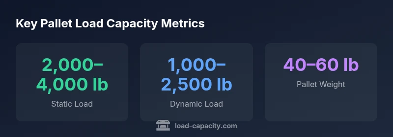 The load capacity of a wooden pallet depends on construction, wood type, and condition. For a standard 48x40 inch pallet, static capacity typically ranges from 2,000 to 4,000 pounds, while dynamic capacity is usually 1,000 to 2,500 pounds. Capacity varies with wood species, moisture, and wear. Always verify ratings on the data plate or through a structural assessment.