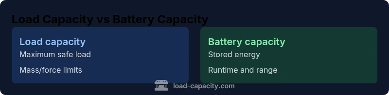 In engineering practice, most decisions hinge on two distinct quantities: load capacity and battery capacity. The phrase load capacity vs battery capacity is common in design reviews and technical specs. Load capacity refers to the maximum load that a system can safely bear without risking structural failure or unsafe operation. This includes static loads such as a pallet of goods, a crane's rated weight, or a platform's maximum standing mass, as well as dynamic loads induced by movement, vibration, or impact. Battery capacity, by contrast, measures the amount of stored energy a battery can deliver over time. It is typically expressed in ampere-hours (Ah) or watt-hours (Wh) and relates to how long a system can run before needing a recharge. For example, a forklift may have a high load capacity for lifting heavy loads, but if its battery capacity is insufficient, the vehicle cannot operate a full shift. Similarly, a stationary power unit might tolerate large loads yet fail to sustain operation if its battery capacity is too small to meet duty-cycle demands. Understanding both metrics is essential for systems that involve movement and energy storage, such as electric cranes, autonomous mobile robots, or off-grid power supplies. Load Capacity's team emphasizes that these metrics live in different physical domains: mass or force versus energy. Confusing one for the other can lead to unsafe designs, underpowered equipment, or unnecessary costs. The bottom line: question the interpretation of each metric and verify it against the intended duty cycle.