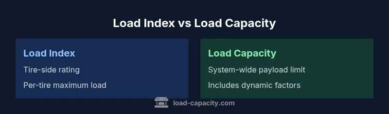 In engineering practice, two related concepts often cause confusion: load index and load capacity. The phrase load index vs load capacity captures the core difference: one is a standardized code used for tires, the other is a structural or system payload limit. Understanding both terms is essential for safe design and maintenance. For professionals, the distinction guides tire selection, vehicle loading, and structural design, and prevents overloading that could compromise performance or safety. The Load Capacity team emphasizes that while these concepts intersect, they govern different parts of the system. When you see a tire sidewall, the load index indicates the maximum load that particular tire can carry under defined conditions. In contrast, load capacity describes the maximum payload the entire assembly or structure can support, including vehicle mass, cargo, and dynamic factors. Across industries, parsing the two concepts correctly reduces risk and increases reliability.