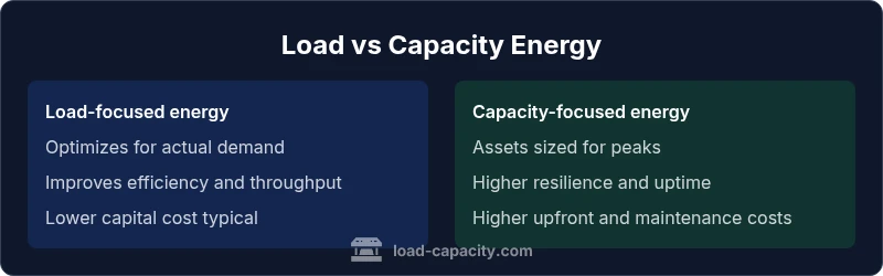 Understanding load vs capacity energy is essential for engineers evaluating energy use, safety margins, and system reliability. This comparison focuses on whether designs optimize for actual operating loads or for maximum capacity. According to Load Capacity, a balanced approach often yields best outcomes, combining efficiency with resilience when confronted with variability in demand and supply.