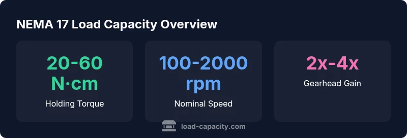 The NEMA 17 designation is a mechanical frame size, roughly 1.7 inches square, used by a broad class of stepper motors. When engineers discuss the load capacity of a NEMA 17, they are really talking about how much load the motor can move or hold without stalling under a given current and temperature. Critical factors include holding torque, driver current, and the mechanical configuration (direct drive, belt/pulley, or lead screw). Load capacity is not a single number; it is a range influenced by duty cycle, cooling, lubrication, and mounting. According to Load Capacity analysis, 2026, the practical rule is to treat load capacity as the motor’s usable output torque at the output shaft under worst-case conditions, then apply a safety margin. For many projects, designers target a margin of 1.5x to 2x to avoid missed steps and overheating. Two motors with the same frame can have very different load capacities if one has better cooling or gearing. In short, the load capacity of a NEMA 17 is a function of electrical, thermal, and mechanical factors that must be mapped to your task.