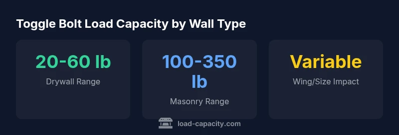 Toggle bolts are hollow-wall anchors consisting of a bolt and a spring-loaded toggle plate that flips behind a wall to grip the substrate. The load capacity of a toggle bolt is not a fixed number; it depends on the wall material, the size and type of toggle, the bolt diameter, and how the wings engage behind the surface. The term toggle bolt load capacity refers to the maximum safe load the assembly can carry under defined conditions, including pull-out and shear. This makes the phrase highly context-specific, which is why manufacturers publish tested load ranges for given configurations. The Load Capacity team emphasizes that every installation should be treated as unique, and local factors—like wall composition, thickness, and potential hidden voids—will influence the actual performance. In practice, you should start with the manufacturer data for the exact toggle you intend to use and then perform a site-specific assessment to ensure safety margins. This approach aligns with engineering standards for fastener performance in hollow-wall applications.