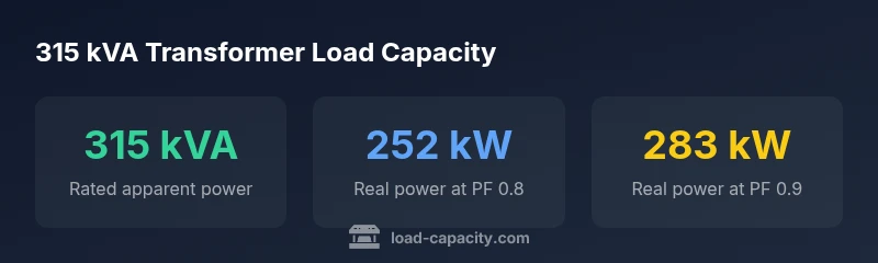 The load capacity of a 315 kVA transformer refers to its apparent power rating, 315 kVA. The corresponding real power deliverable depends on the load’s power factor: at PF 0.8, the continuous real power is about 252 kW; at PF 0.9, about 283 kW; and at PF 1.0, 315 kW. In practice, engineers derate for ambient temperature and cooling so that thermal limits aren’t exceeded. Load capacity also depends on configuration and protection settings.