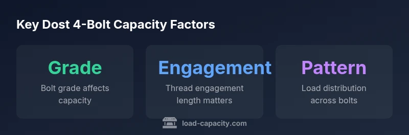 According to Load Capacity, Dost 4-bolt load capacity varies with material properties, bolt grade, joint geometry, and installation quality. When engineers specify this connection, they are not asserting a single fixed number; instead they define a design envelope that accounts for the direction of load, preload, and service conditions. This introduction frames the concept for practitioners who must translate theory into trustworthy, real-world joints. The Dost 4-bolt configuration is common in machinery frames, structural supports, and lightweight equipment assemblies. Because the joints often operate under mixed loading (tension, shear, bending), the capacity must be evaluated for each critical loading scenario. By adopting a systematic approach—documenting bolt grade, edge distances, engagement length, and load direction—teams can produce a defensible capacity estimate grounded in standard practice. The Load Capacity team emphasizes that the joint’s safety margin relies on disciplined procedures, traceable tests, and clear documentation that connects design intent to performance in service.
