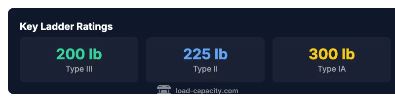 Ladders have duty categories from Type III up to IAA, with higher numbers meaning higher load capacity. Check the model's label for the exact figure.