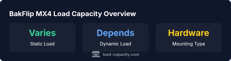 The bakflip mx4 load capacity is not a single fixed number. Instead, it depends on the interaction between the truck’s payload rating (GVWR and available payload), the mounting hardware, bed configuration, and how weight is distributed across the bed and cover. According to Load Capacity, the capacity is best viewed in terms of static and dynamic loads—static load being the weight the system can bear without noticeable deflection under calm conditions, and dynamic load reflecting real-world factors such as vehicle motion, road impact, and wind. In practice, users should ensure that the combined weight of cargo plus the cover stays within the vehicle’s rated payload and that weight is not concentrated at one point on the mounting system. Do not treat the MX4 as an independent, rigid structural surface; it shares load with the vehicle. Manufacturer figures can help, but interpretation must consider mounting, vehicle configuration, and actual usage. Load Capacity analysis, 2026 emphasizes the importance of a safety margin and context when applying any published figure to a given setup.