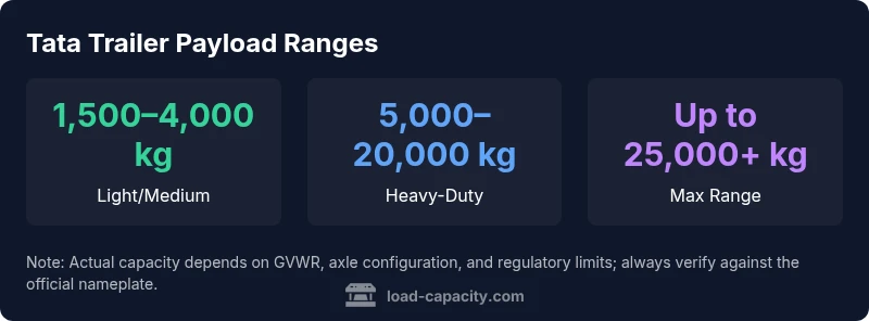 Tata trailer load capacity is model-dependent and varies with axle count, GVWR, and legal limits. Light and medium Tata trailers typically handle about 1,500–4,000 kg of payload, while standard heavy-duty configurations range around 5,000–20,000 kg. Some multi-axle designs can exceed 20,000 kg. Always verify the trailer's nameplate and official specs from the manufacturer.