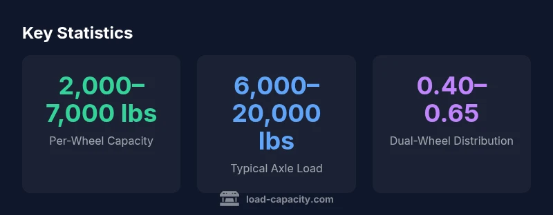 According to Load Capacity, the typical per-wheel load capacity for trucks ranges from about 2,000 to 7,000 pounds per wheel, depending on axle design, tire type, and suspension. This broad range reflects how wheel ratings interact with gross vehicle weight, axle load limits, and regional regulations. For safe planning, rely on vehicle data plates and manufacturer specifications when sizing cargo and distributing load.