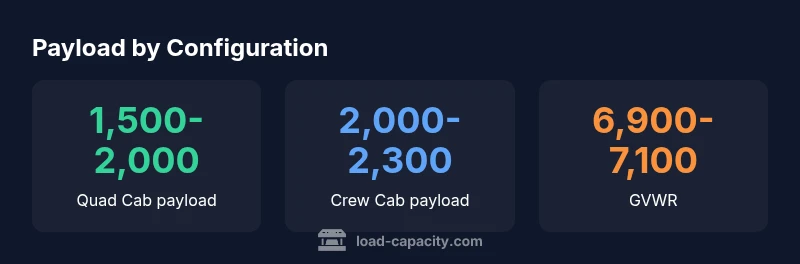 | Crew Cab, 6 ft bed | 2,000-2,300 pounds | 6,900-7,100 pounds | Max payload in some configs |