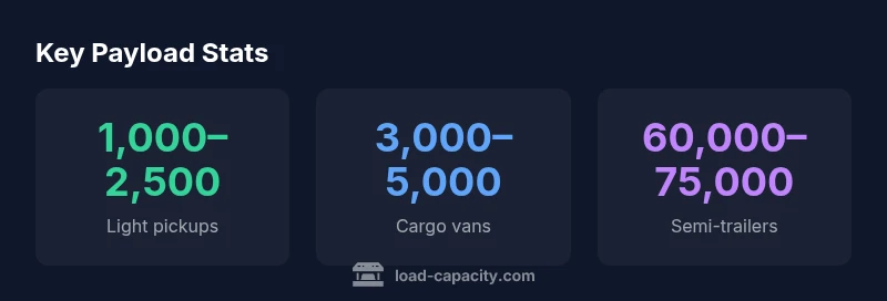 Truck load capacity is the maximum weight of cargo a vehicle can safely carry, defined by its payload rating. It depends on GVWR and curb weight, and varies by class. Typical ranges: light-duty pickups 1,000–2,500 lb; cargo vans 3,000–5,000 lb; medium-duty trucks 6,000–14,000 lb; tractor-trailers around 60,000–75,000 lb payload. Always verify exact figures from the manufacturer.