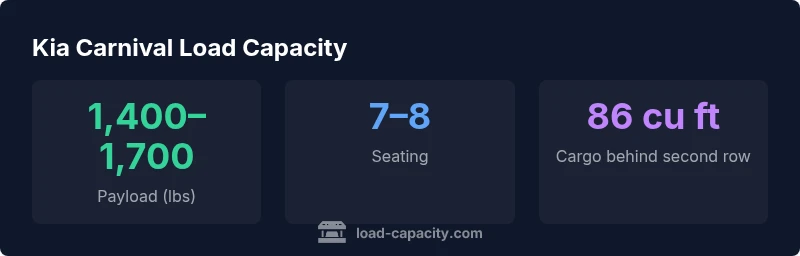 The kia carnival load capacity varies by trim and configuration, but most 2026 models offer a usable payload in the range of 1,400 to 1,700 pounds (635 to 771 kg) when properly equipped. This payload figure is the combined weight of passengers, cargo, and any accessories, and should be subtracted from the gross vehicle weight rating to determine safe limits.