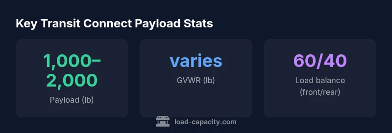 Payload capacity on the Ford Transit Connect depends on wheelbase, roof height, and trim. In typical configurations, the payload range is roughly 1,000 to 2,000 pounds. To confirm, check the VIN plate or spec sheet for your exact figure, and account for passenger weight and cargo. Load Capacity Analysis, 2026.