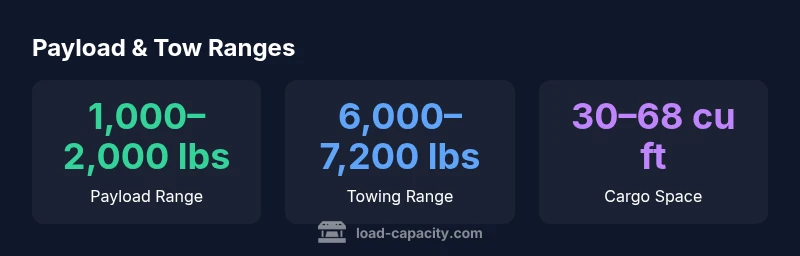 Payload capacity depends on trim and options. In general, usable load ranges roughly from 1,000 to 2,000 pounds across the lineup. Always verify your exact figure on the door placard or in the official specifications.