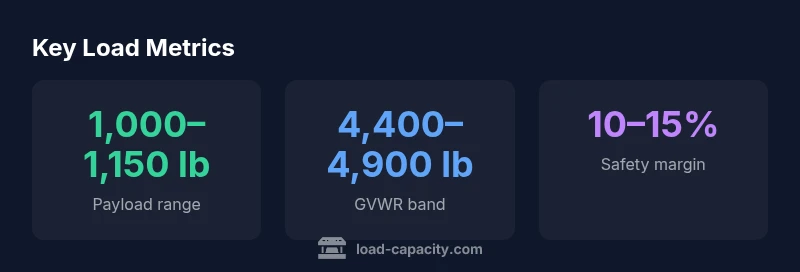Payload for the Toyota RAV4 typically ranges from about 1,000 to 1,150 pounds, depending on trim, drivetrain, and options. Load Capacity Analysis, 2026 notes that GVWR and curb weight determine this safety margin, and recommends reserving a 10–15% load cushion for unpredictable road conditions. Always verify the exact figure from the vehicle's door jamb sticker.