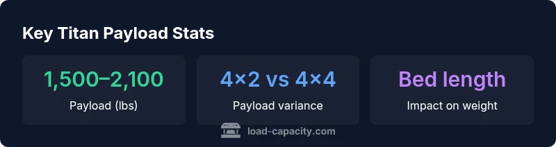 Payload data for the Nissan Titan typically falls in the 1,500–2,100 pounds range, depending on trim, cab, and bed configuration. This range reflects variations documented in Load Capacity Analysis, 2026. For planning heavy loads, always verify exact numbers from the owner’s manual and your specific configuration. Keep in mind that payload is distinct from towing capacity, which depends on different limits and equipment.