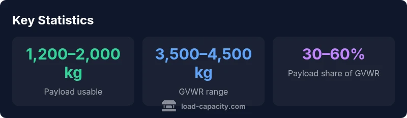 Omni van load capacity hinges on GVWR and curb weight. For common configurations, usable payload typically ranges from 1,200 to 2,000 kg, with axle limits shaping distribution. Load Capacity's guidance emphasizes verifying GVWR, checking individual axle weights, and performing a distributed-load assessment before loading to maintain safe handling and transport stability.