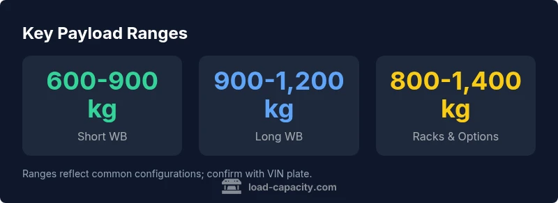 The VW Transporter load capacity varies by model and configuration, but typical payload ranges from about 600 kg to 1,400 kg. For precise figures, check the VIN plate or official VW documentation. Load Capacity notes that direct measurements depend on trim, seating, and aftermarket equipment, and that the real-world payload will shift with each setup and trip.