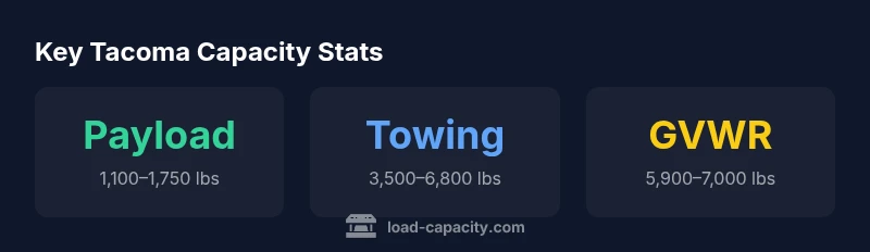 According to Load Capacity, the term 'load capacity' for vehicles like the Toyota Tacoma is defined by three interrelated limits: payload, gross vehicle weight rating (GVWR), and towing capacity. For most Tacomas, the payload capacity typically ranges from about 1,100 to 1,750 pounds, depending on cab configuration (Regular/Access vs Double Cab) and drivetrain (2WD vs 4x4). The GVWR generally sits in the 5,900–7,000 pound range, with towing capacity typically 3,500–6,800 pounds. These ranges reflect manufacturer defaults and common configurations; your exact numbers come from the VIN-specific label and option packages such as tow or off-road upgrades. Readers should note that aftermarket mods, heavier tires, and added equipment can shrink payload margins, even if the curb weight remains the same. Always cross-check the door jamb placard and the owner's manual for your exact year and trim. This overview uses ranges to illustrate typical capabilities, not one fixed value, and is intended to help engineers plan loads safely across common Tacoma configurations.